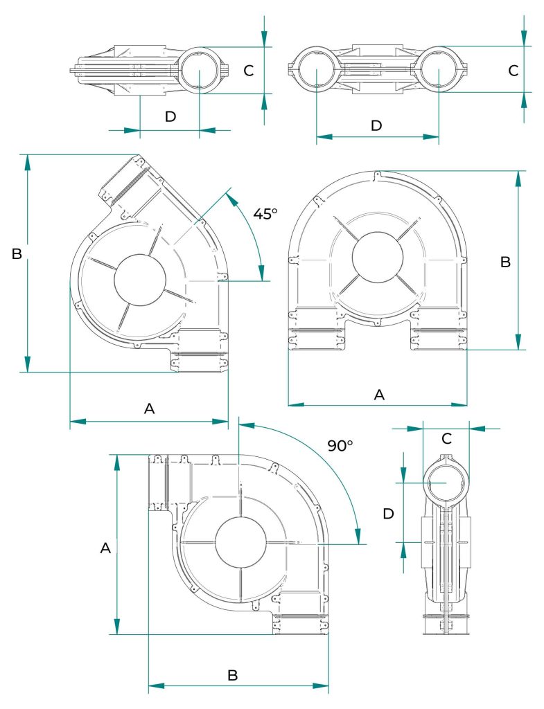 | Coudes | Tuyau | Poids | Dimensions A - B - C - D |