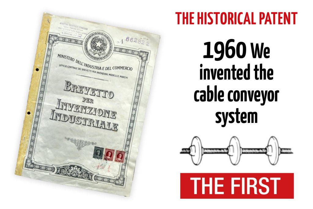 Le brevet historique témoigne qu’en 1961, M. Camillo Pirovano, président d’AZA INTERNATIONAL, a inventé le système innovant de transport par câble, basé sur un câble en acier avec des disques en plastique fixés par moulage.
